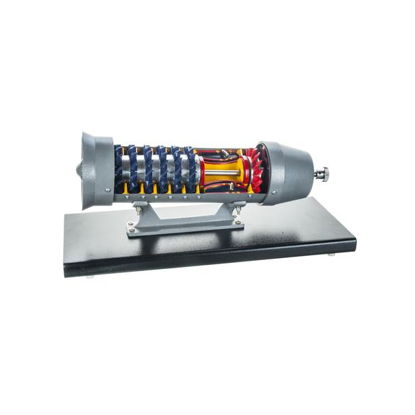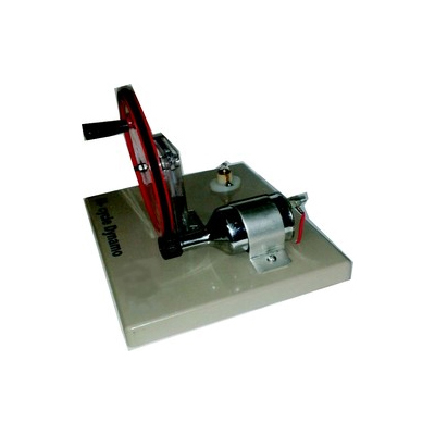 A cycle dynamo mounted on a wooden base 200 x 115 x 12 mm & provided with two sets of gears driven by a hand crank for fast or slow rotation. Two 4 mm socket terminals are provided for the dynamo output. Connected in parallel with an MES lamp holder & 2.5 V bulb.