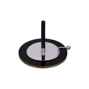 A plastic disc 16 cm diameter in wooden base, a brass nickel plated 100 mm dia plate with ebonite handle & a small brass contact sphere.