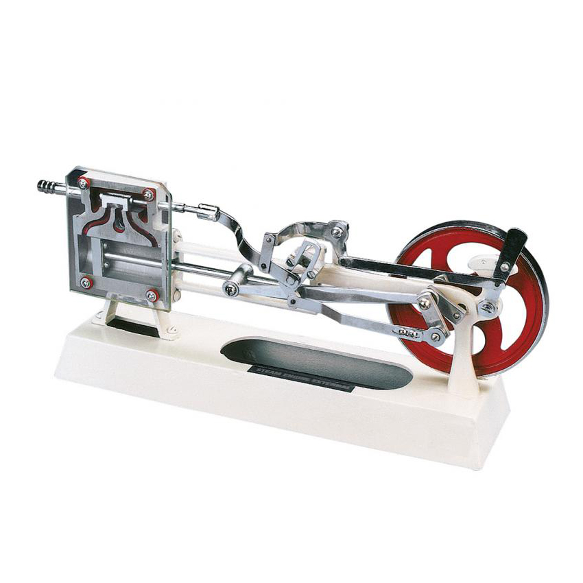 The engine model comprises a section cut metal cylinder covered with transparent acrylic plate to observe the working parts -piston, valves, link motion and reversing methods.