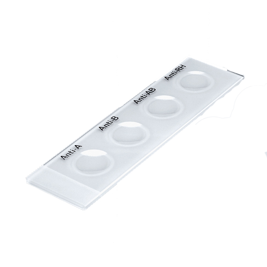 A noncorrosive frosted glass slide 75 x 56 x 3 mm. with bevelled edges having concavities, used for Serodiagnostic tests.
