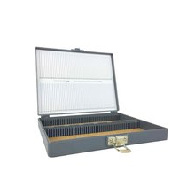 Wooden cabinet for keeping 75 x 25 mm. glass slides in vertical position in wooden grooves individually provided with index cardholder and lock.
