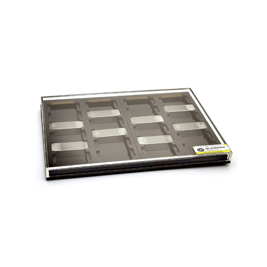 Size 100 x 100 x 10 mm. thick with 12 concavities, each 21 mm. in dia. x 4 mm. deep. Surface of the slide is frosted to provide smooth writing. Surface edges and corners are bevelled and polished
