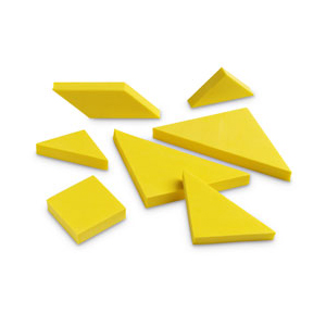 Tangram, Bulk Plastic Tangram Set for Maths Lab. Includes pieces each in red, green, blue, and yellow. Comes in a plastic storage container.