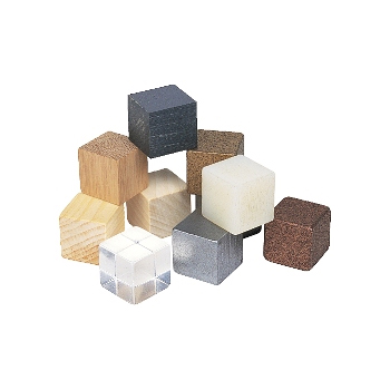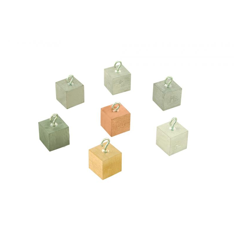 Set of 10 cubes one each of metals brass, lead, iron, copper, aluminum, zinc, and one each of marble, glass, hardwood, softwood.