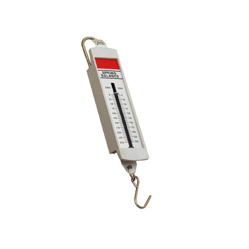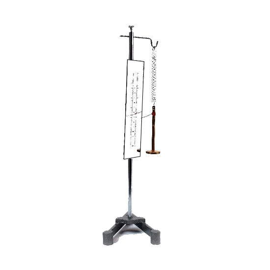It consists of a scale mounted vertically on stand, a spring with pointer and provision to hang set of slotted weights.