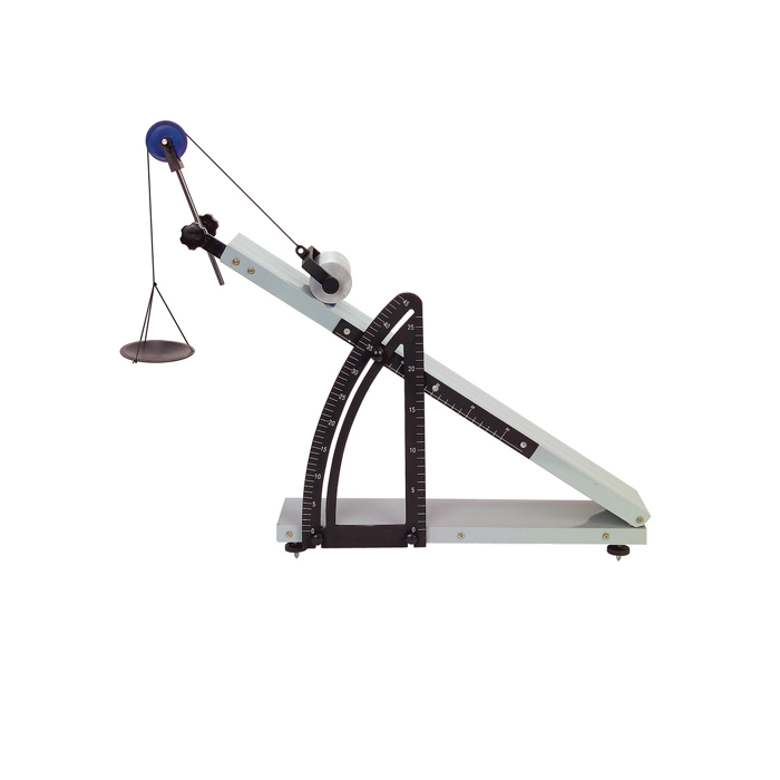 Simple, hardwood comprising, cut-away base to allow cord to hang freely and hinged plane 60 x 7.5 cm. with aluminum pulley 28 mm. diameter, and stepped lower face to accommodate wood block for setting at angles between 24 and 45 deg. Approximately with cylindrical metal roller and scale pan.