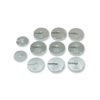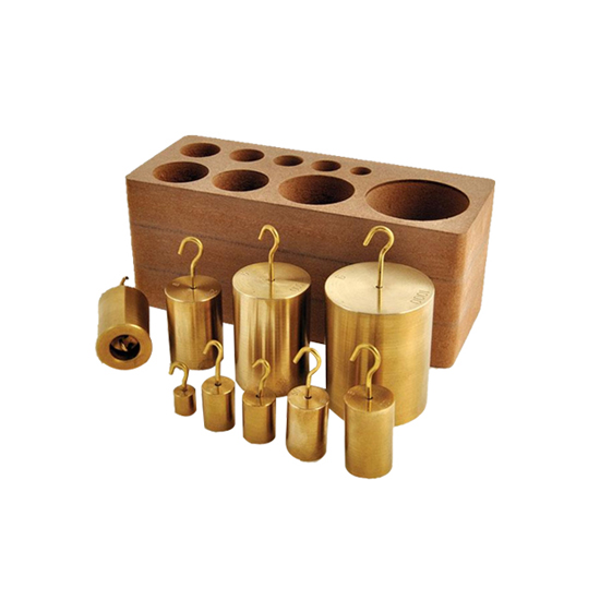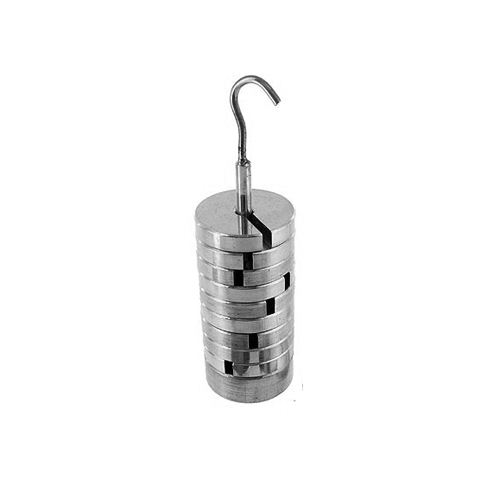 series of masses 1 x 1Kg; 1x500gm; 1 x 200 g; 1 x 100 g; 1 x 50 g; 2 x 20 g; 1 x 10 g; 1 x 5 g, 2 x 2 g; 1 x 1 g, also available without hook.