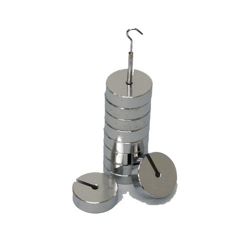 Made of iron, chrome plated. This set includes nine slotted masses each of 50 g with a 50 g wire hanger making total mass of 500 g; masses do not fall off when assembled in a set. Tolerance 3%. Also available in 1000g