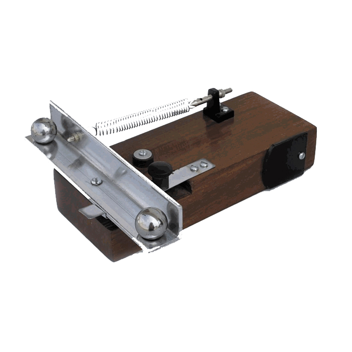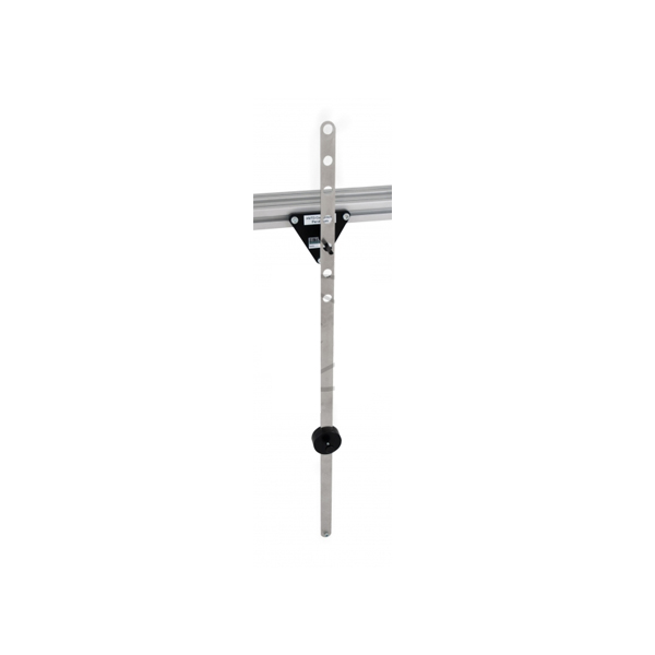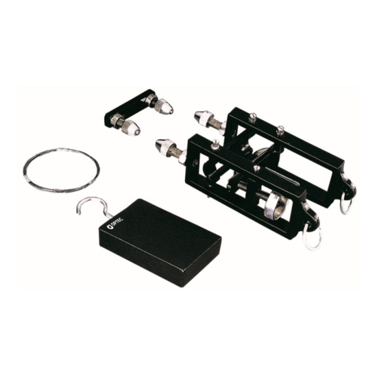 Simple form but efficient. Consist of a brass scale 10 cms. long and vernier to read 1/10mm with V slides clamps, guides for wire ceiling attachment and tension weight.