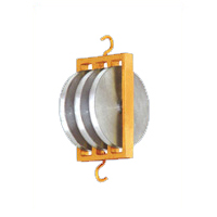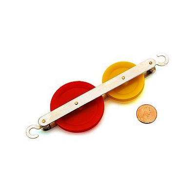 Two aluminum pulley wheels 50 mm dia., mounted in brass frame with two hooks.