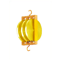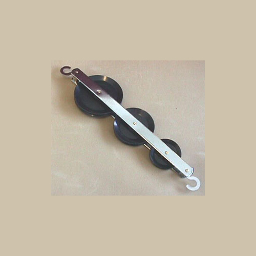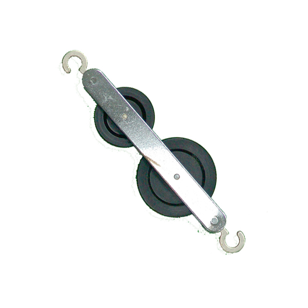 Three plastic pulley wheels 50mm dia, mounted in aluminum frame, with two hooks.