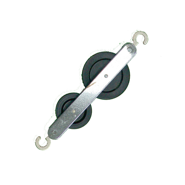 Two plastic pulley wheels 50mm dia., mounted in aluminum frame, with two hooks.