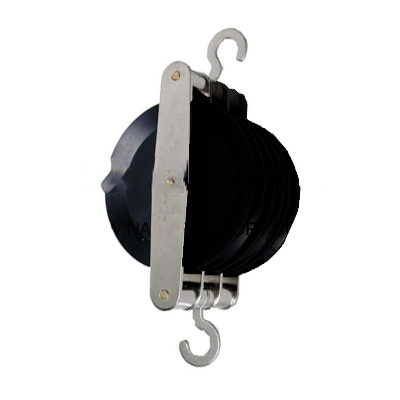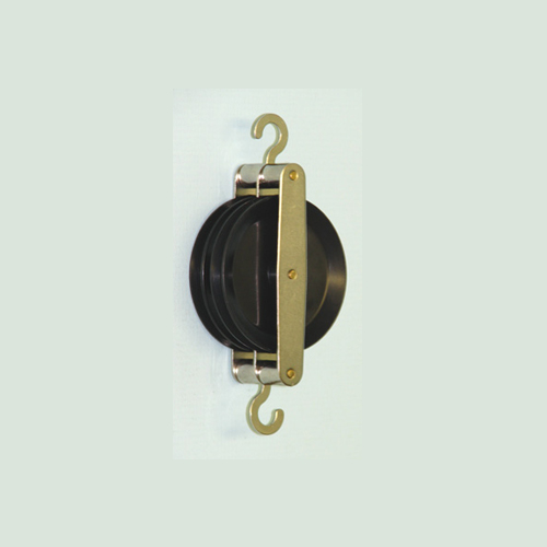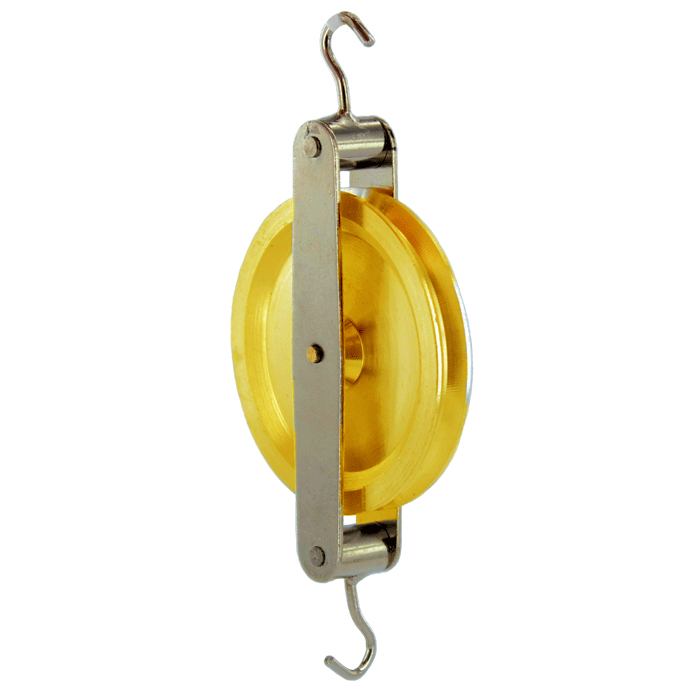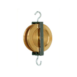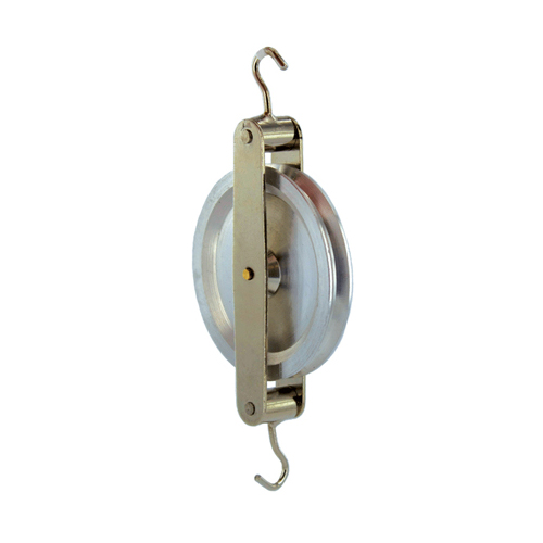 aluminum Pulley 50 mm dia, mounted in brass frame with two hooks.