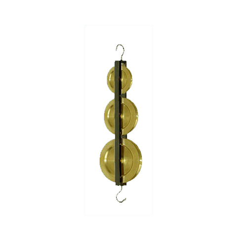 Three aluminum Pulley 25mm, 38mm and 50 mm (Approx.) dia, mounted in brass frame with two hooks.