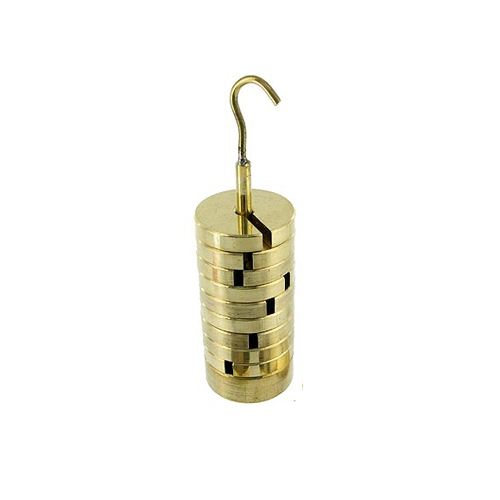Slotted Brass Weight Set - Made of brass. This set includes nine slotted masses each of 10 g with a 10 g wire hanger making total mass of 100 g; masses do not fall off when assembled in a set. Tolerance 3%. Also available in 200g, 500g, 1000g.