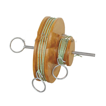 Two grooved wheels of hardwood, dia 150 and 50 mm respectively making a double wheel pivoted on a spindle 10 mm diameter which projects for 100 mm distance.