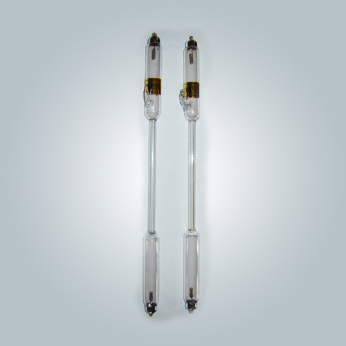 A glass tube constricted along the middle portion to concentrate the discharge glow & provided with cylindrical metal electrodes connected to 4 mm plugs mounted in moulded plastic end caps.