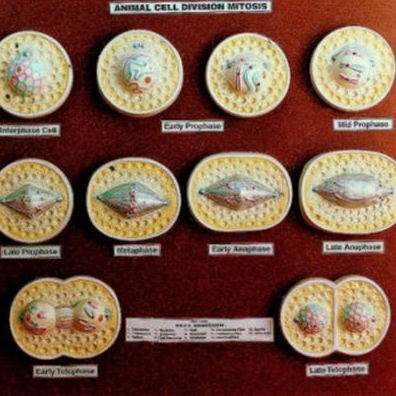 Animal Cell Division Mitosis - A set of 10 models, showing resting cell, early prophase, prophase, late prophase, metaphase, anaphase, late anaphase, Telophase and daughter cells, mounted on base with key card.