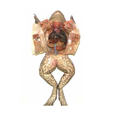 Model showing dissected structure of frog in detail, mounted on base with key card.